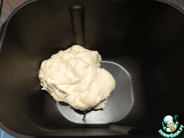 Помещаем ведерко в хлебопечку и включаем режим замеса теста. Тесто сначала получится очень тугое, затем станет чуть мягче.
