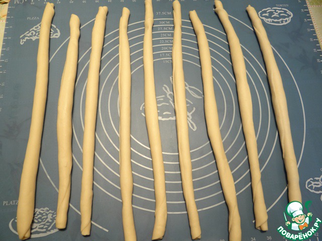 Готовим такие "рулетики" из оставшихся кусочков теста (тесто, с которым Вы не работаете, надо постоянно накрывать пленкой, т. к. оно быстро засохнет).