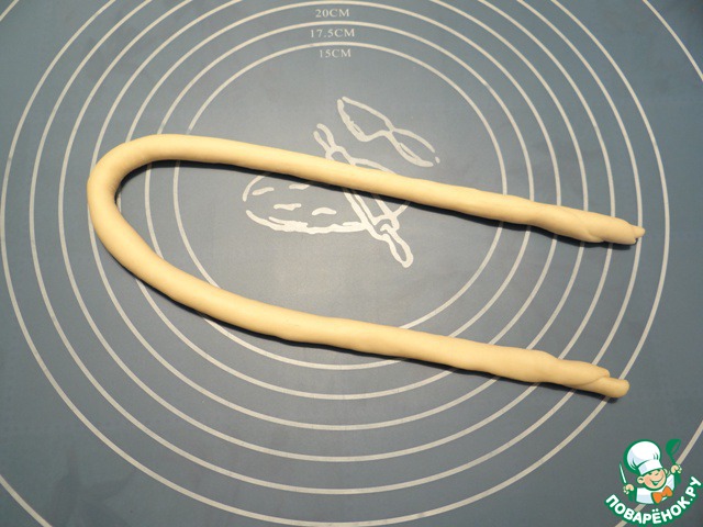 Затем скатываем тесто в плотный жгутик. От длины жгутика будет зависеть размер хлеба, поэтому можно раскатывать овал меньшего размера, тогда коса у хлеба будет потолще).