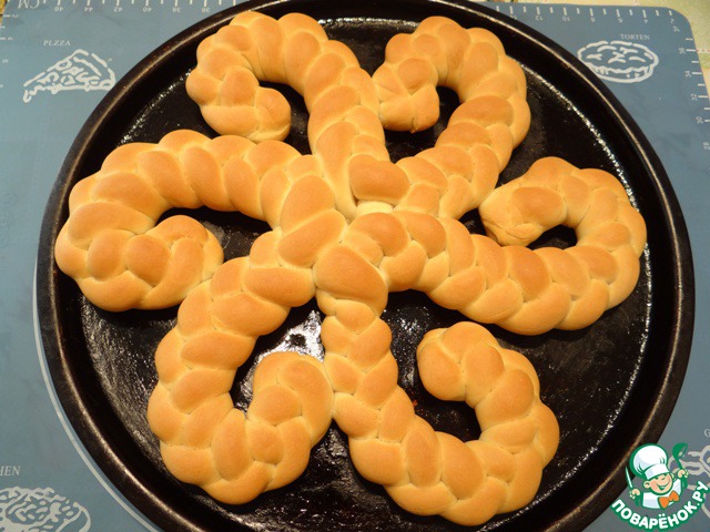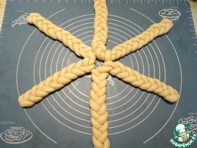 Укладываем дуги из жгутиков с заходом друг на друга, как на фото, разделяя их на 6 частей по три жгута. Не забываем тесто прикрывать пленкой.