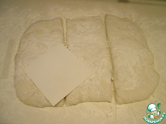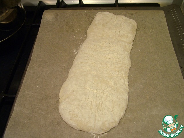 Далее по рецепту. Рабочую поверхность обильно присыпать мукой. После последней ферментации очень аккуратно переворачиваем миску с тестом и вываливаем (не помогая руками) тесто. Оно должно вывалиться под собственным весом. Очень аккуратно распределяем тесто в прямоугольник толщиной около 3,5 см. Сверху присыпаем мукой.