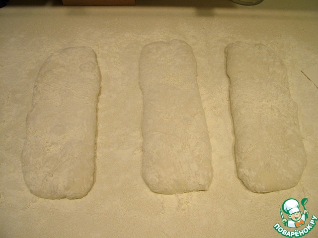 Руками формируем прямоугольные заготовки. Всё делаем с большой нежностью, чтобы не выпустить воздух из теста. Накрываем полотенцем и оставляем на расстойку на 1,5 часа. Если в помещении прохладно, то на 2 часа. Можно сразу перед расстойкой переложить заготовки на листы пергамента, чтобы потом их меньше травмировать.