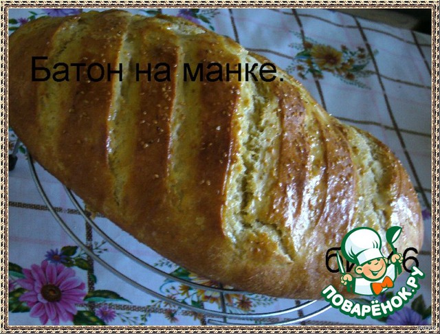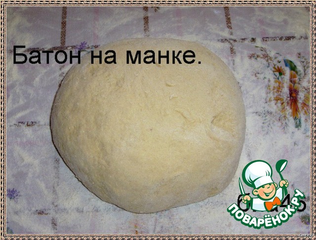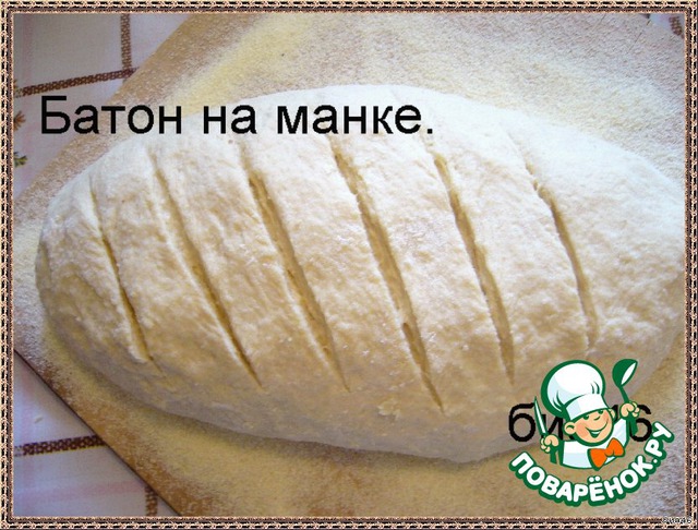 Сформируем батон, разделочную доску обильно присыпем манкой и аккуратно перенесем на нее наш батончик, сделаем на нем насечки, накроем полотенцем и оставляем для подъема на 30 минут.