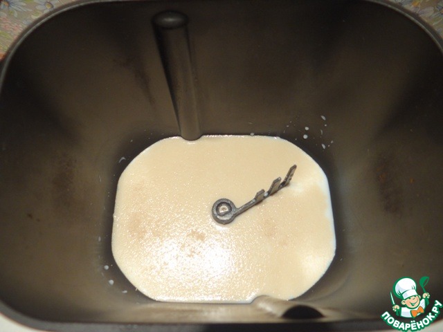 Тесто я, как и обычно, замешиваю с помощью хлебопечки, но можно замесить и обычным способом. В ведерко хлебопечки наливаю теплую воду и молоко, добавляю дрожжи и оставляю минут на 5-10.