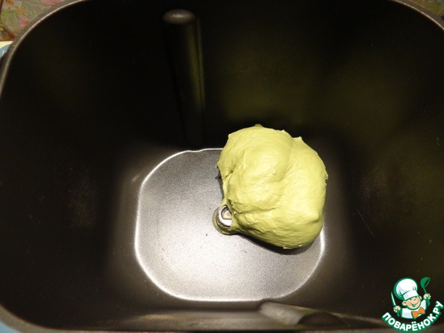 Ведерко опять помещаю в хлебопечку и включаю режим замеса теста примерно на 7 минут для тщательного перемешивания. Готовое тесто тоже убираю в миску, накрываю пленкой и даю белому и зеленому тесту увеличиться в объеме примерно в 2 раза.