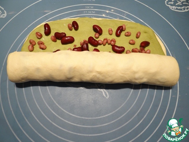 Раскатываю зеленое тесто такого же размера, что и белое, накрываю им белое тесто с фасолью.