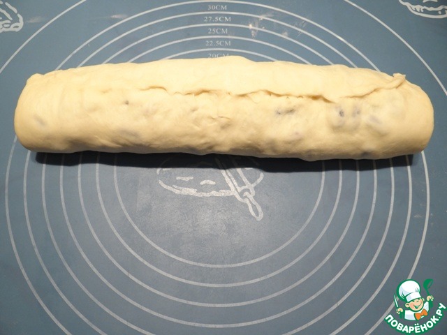 Используя муку для подпыла, раскатываю с помощью скалки квадрат из белого теста (по длине формы для выпечки).