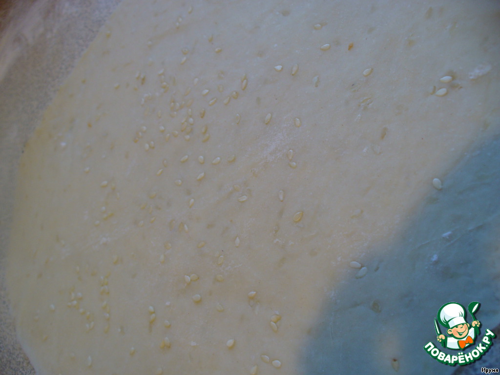 Можно еще сверху посыпать кунжутом (а можно, в первом шаге не добавлять кунжут в муку, а сделать так) и "вкатать" его скалкой.