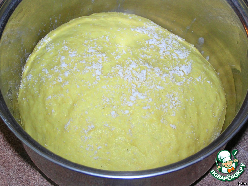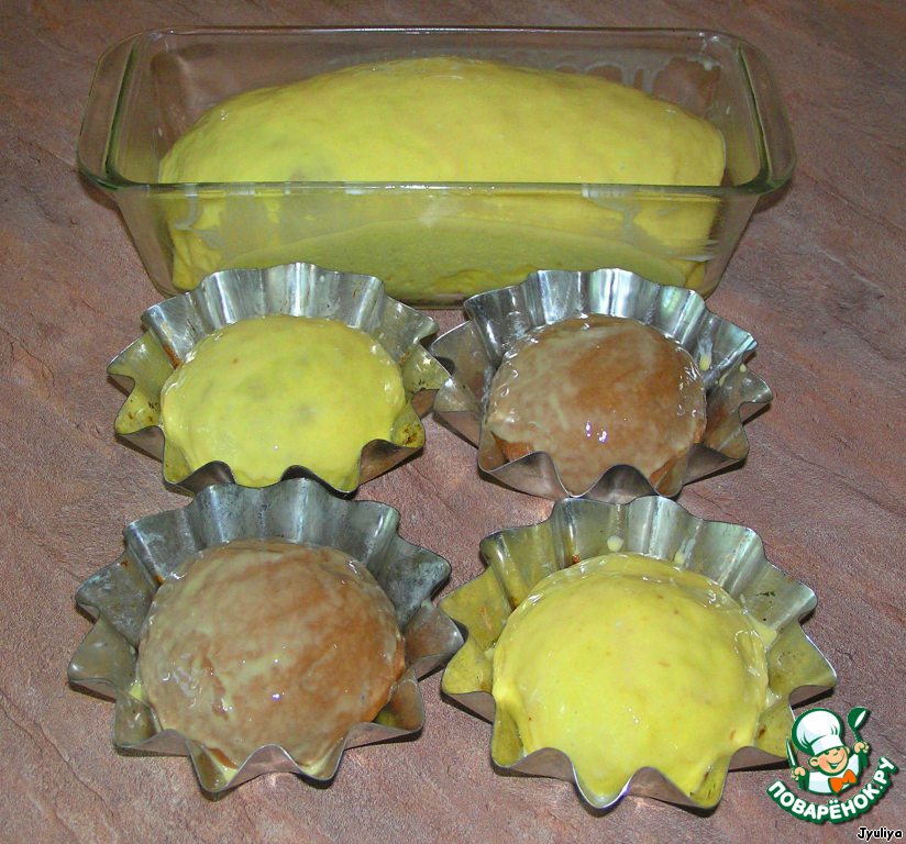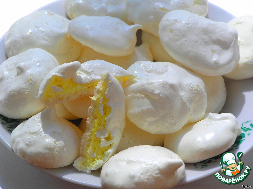 В стакан теплого молока добавить дрожжи, 1 ст.л. сахара, 1 ст.л. муки, перемешать, оставить на 20-30 минут. Желтки отделить от белков. Четыре желтка растереть с 0,5 стаканом сахара добавить в молоко + дрожжи. Сюда же добавить растопленный маргарин, остудить. Белки 4 яиц взбить в крепкую пену, добавить, аккуратно перемешать. Добавить ванилин и лимонный сок (2 ст.л.).