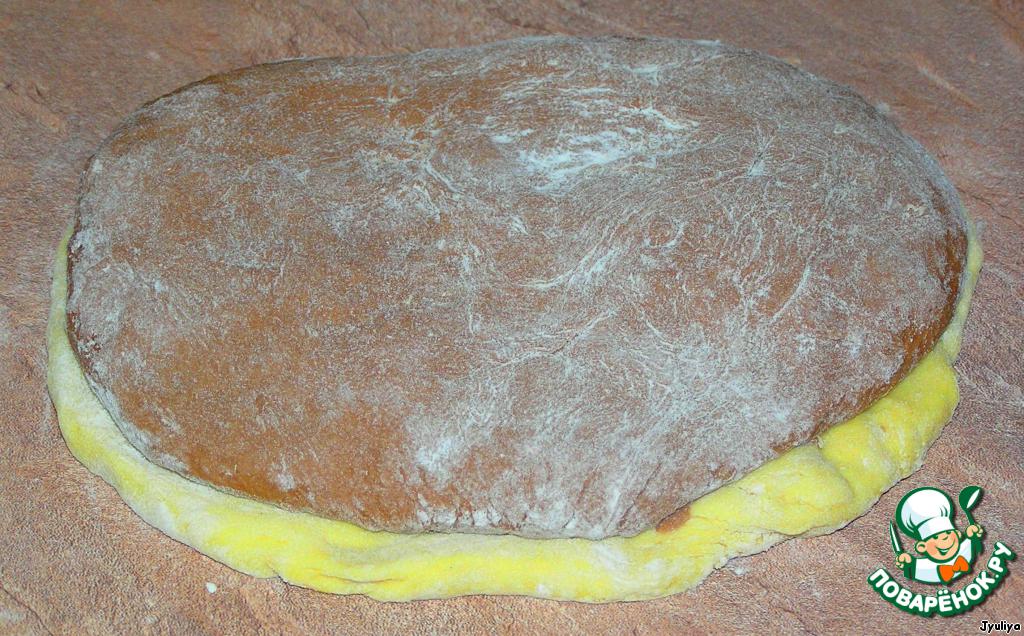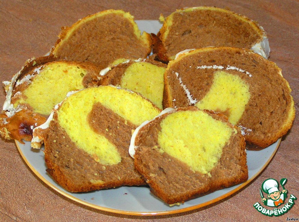Форму смазать растительным маслом. На лепешку белого теста выложить лепешку темного теста и скатать рулетом. Можно наоборот, на лепешку темного теста - белого и так же скатать рулетом.