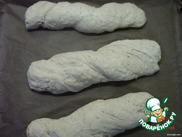 Теперь разделите тесто вдоль на 3 части и каждую такую колбаску скрутите несколько раз, взявшись за концы, в противоположном направлении.