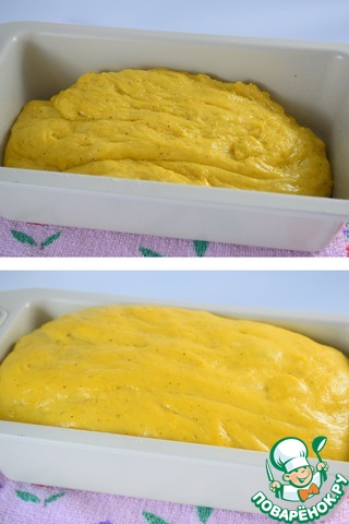 Еще раз перебиваем тесто и выкладываем в смазанную маслом форму (у меня размер 15 х 23 см). Накрываем форму пленкой и убираем на расстойку в теплое место минут на 30 - 40.