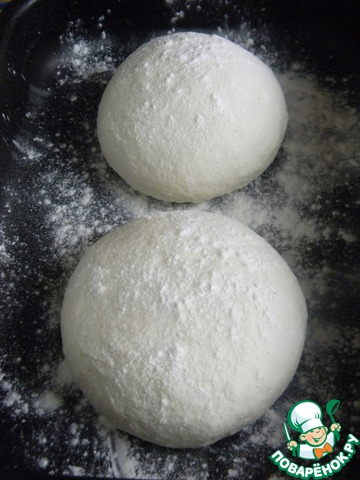 Когда тесто подойдет, сформировать два колобка. Противень присыпать мукой, переложить на него колобки, посыпать мукой, накрыть и снова оставить подняться.