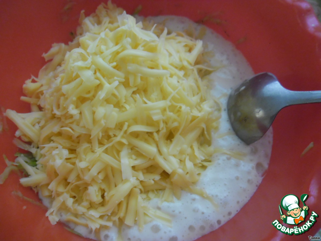 Затем слить образовавшуюся жидкость (не до фанатизма, отжимать огурцы не нужно), перемешать огурцы с укропом и опарой. Добавить натертый на крупной терке сыр (если хотите, чтобы в хлебе были вкрапления сыра, его следует нарезать небольшими кубиками и немного пересыпать мукой). Постепенно подсыпая муку, вымесить эластичное тесто.