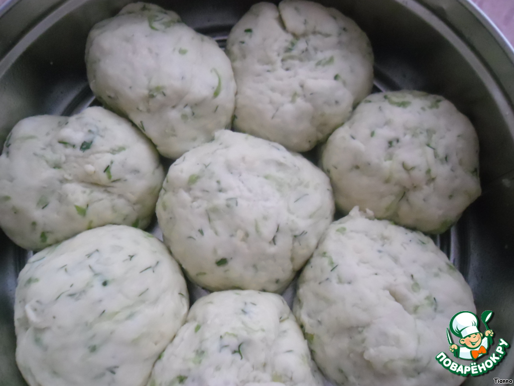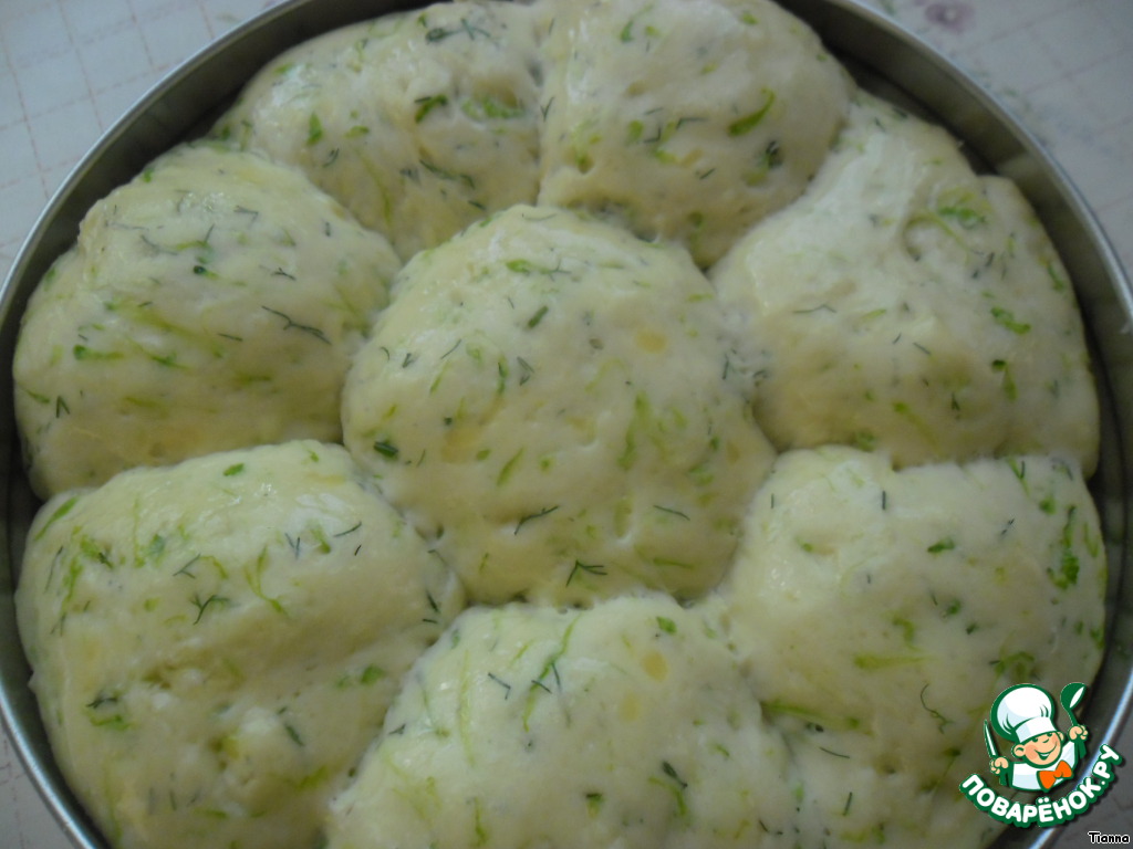 Выложить тесто в форму. Я разделила его на 8 частей, из каждой скатала колобок и выложила в форме цветка. Накрыть форму пленкой и оставить до увеличения теста в 2 раза.