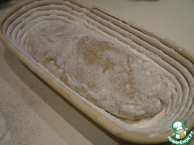 Посыпьте рабочую поверхность ржаной мукой, выложите тесто и сформуйте батон, подсыпая минимальное количество ржаной муки только чтобы тесто не липло. Тесто не должно быть особо липким, но будет очень мягким и податливым. Переложите сформаванную буханку в расстоечную корзинку "вниз лицом" или на лист пекарской бумаги "лицом вверх". Накройте буханку полотенцем и оставьте расстаиваться на 3 часа в теплом месте.