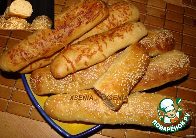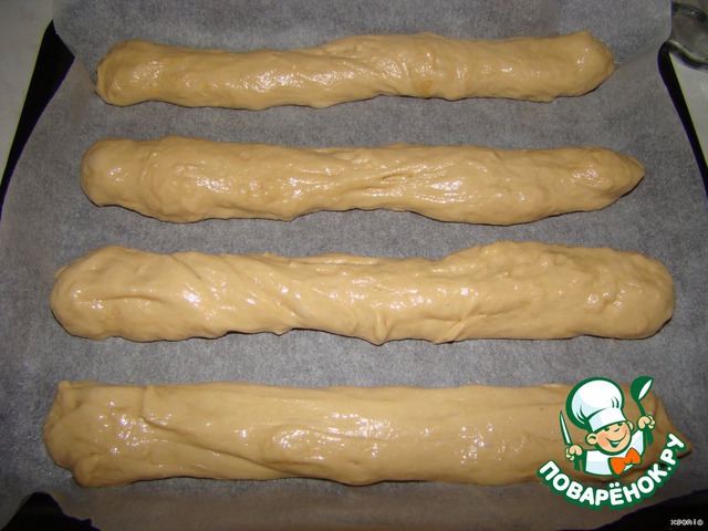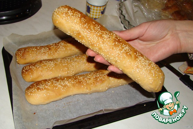 В двух третях стакана..холодного отвара развела дрожжи...сахар...соль......Добавила размягченное масло...яйцо...и треть нормы муки...хорошо все перемешала и поставила на 20 минут в теплое место....Затем вмешиваем оставшуюся муку...и убираем тесто в теплое место походить...Когда тесто подошло...Выкладываем багетиками на противень..Диаметр палочек примерно полтора ...два см.