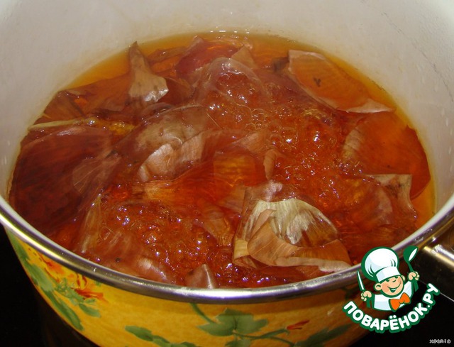 Я всегда собираю шелуху от лука..(например отваром хорошо ополаскивать волосы)))Блестят потом и вообще полезно)))...Шелуху промыла...залила водой...закипятила...и оставила под крышкой остывать