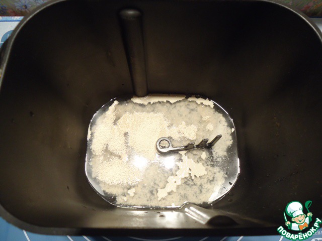 Я замешиваю тесто в хлебопечке, но его можно смело замесить и руками. В ведерко хлебопечки я наливаю теплую воду, насыпаю дрожжи.