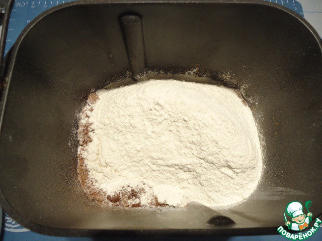 В ведерко хлебопечки к воде и дрожжам добавляю шоколадно-масляную массу, сахар, соль, яйцо, просеянную муку с какао-порошком.