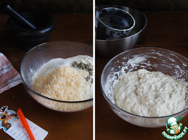 В миску для замеса просеять 300 г. муки, добавить соль, натёртый сыр, чёрный свежесмолотый перец*, оставшиеся сахар и воду и подошедшие дрожжи.