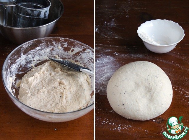 Далее добавлять оставшуюся муку небольшими порциями (у меня в общей сложности ушло 465 г.), вымешивая руками или миксером с насадкой крюк, пока тесто не приобретёт эластичность и мягкость. Слишком много муки добавлять не нужно, дабы не утяжелять тесто.
