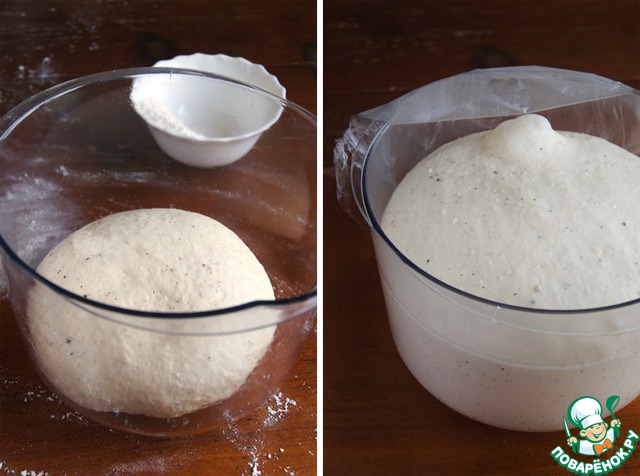 Миску затянуть пищевой плёнкой и оставить для подъёма в тёплом месте до увеличения теста в два раза. У меня за час с небольшим оно выросло вот так.