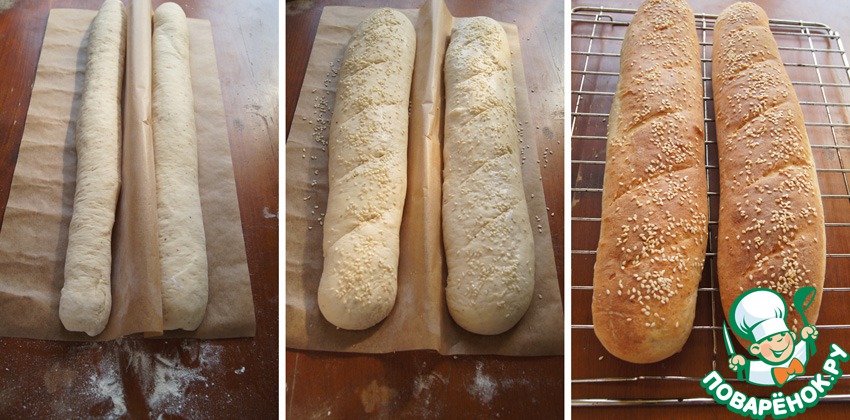 На фото: багеты до и после окончательной расстойки и из печи.