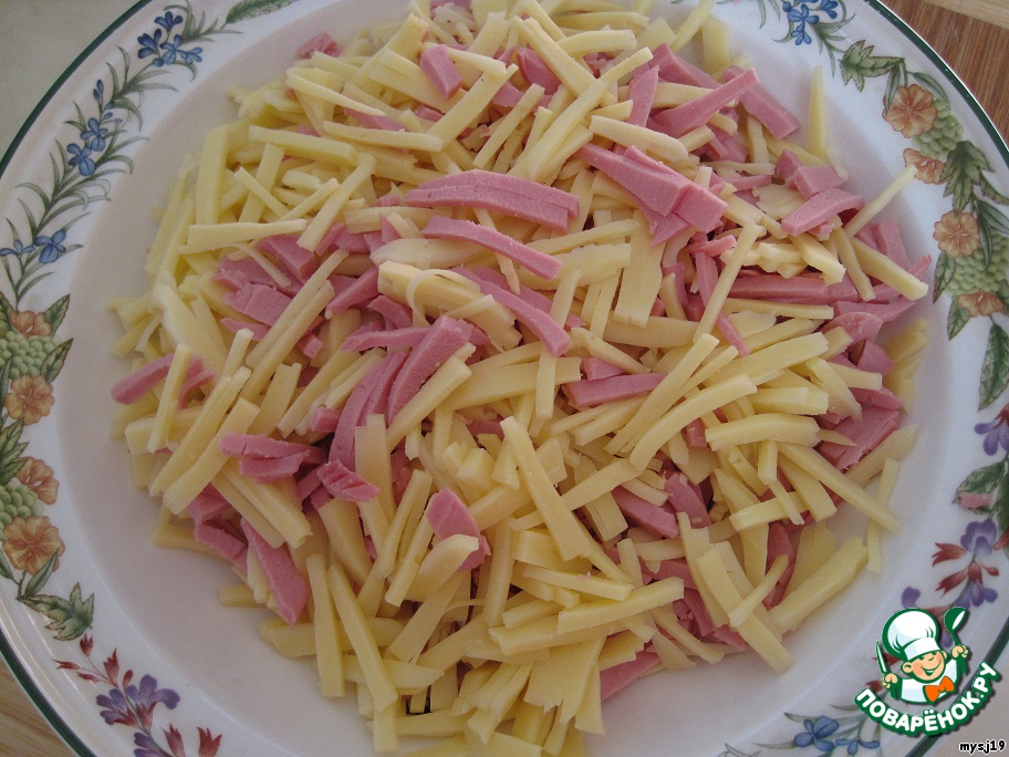 Пока тесто подходит, нарезаем соломкой сыр и ветчину.