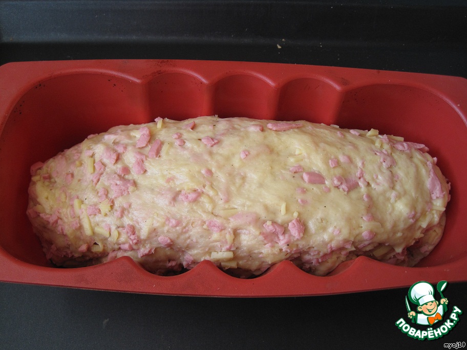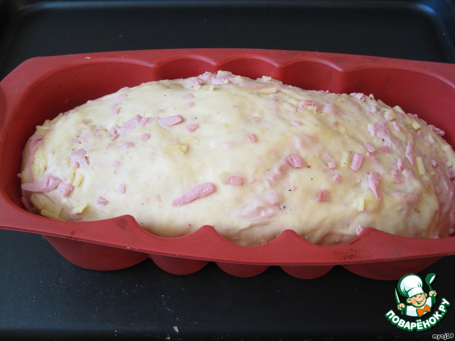 Аккуратно вмешать в подошедшее тесто сыр, ветчину и орехи. Постараться, чтобы масса получилась однородной. Выложить в силиконовую форму и оставить на расстойку (не менее чем на 40 минут) в теплом месте.