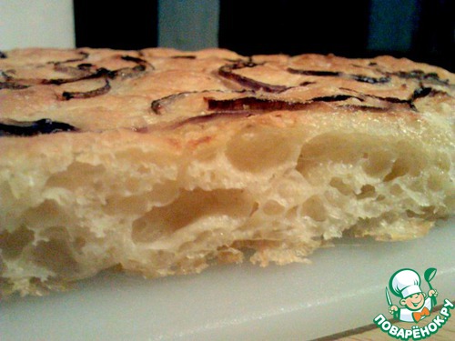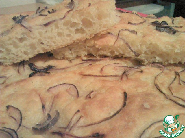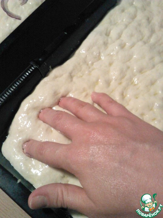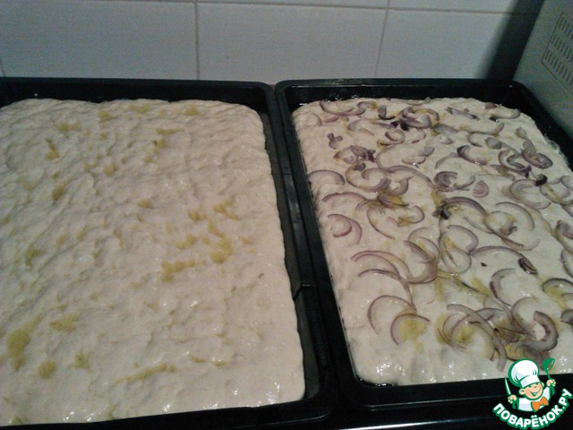 Я сегодня делала двойную норму теста на две фокаччи. Одну - с оливковым маслом и с солью, вторую - с луком. Для луковой фокаччи: поливаем фокаччу оливковым маслом, посыпаем солью, нарезаем лук тонко полукольцами и укладываем поверх теста.