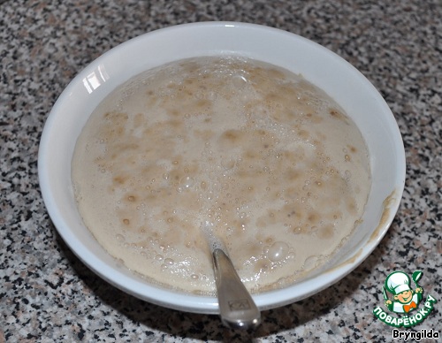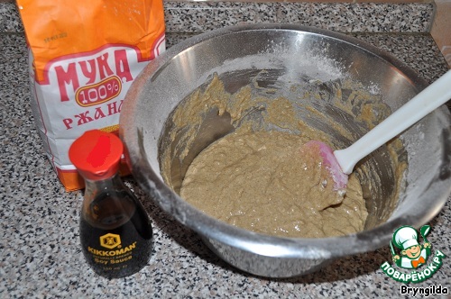 В миску вылить сыворотку и соевый соус, добавить соль и сахар, всыпать ржаную муку и оставить стоять,