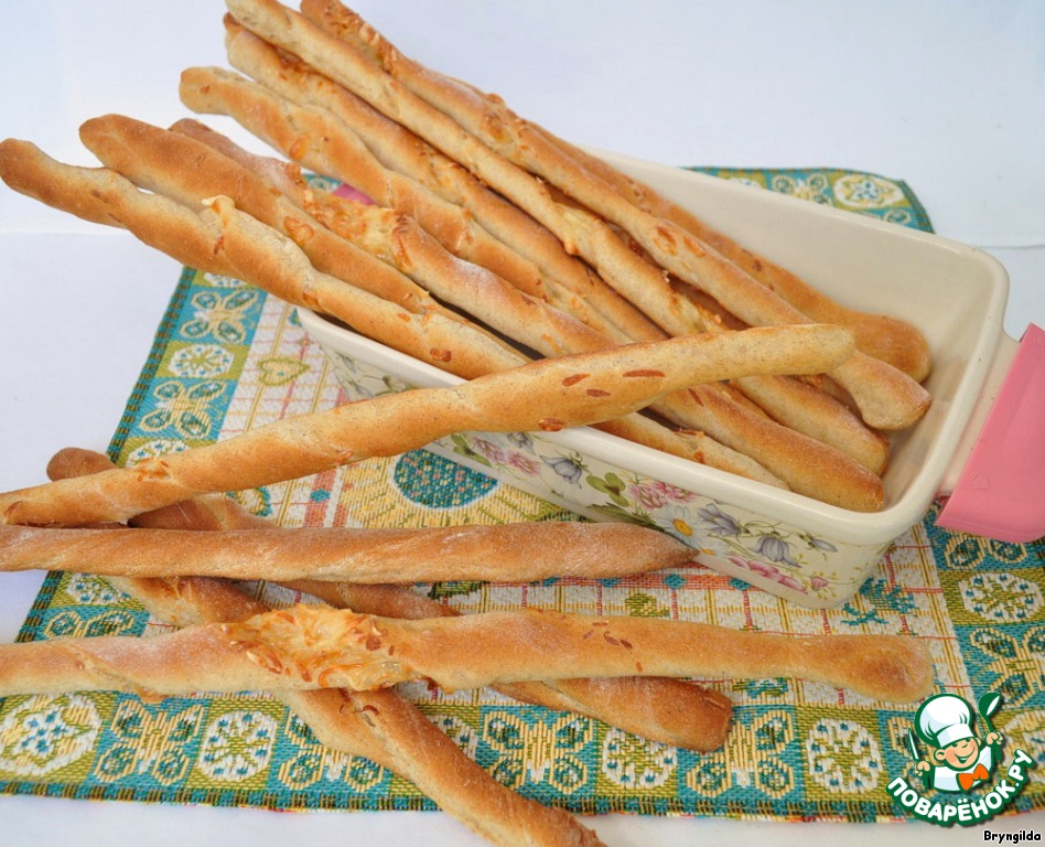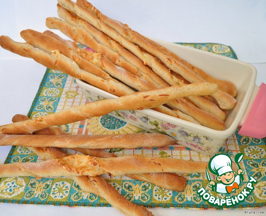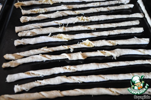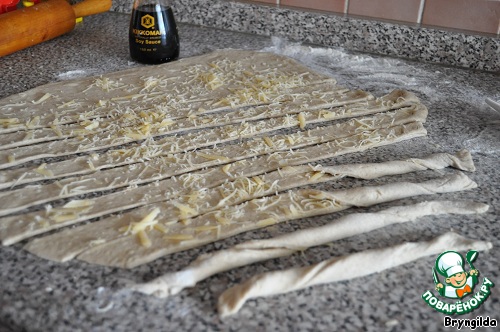 Раскатаем тесто и посыпем сыром. Нарежем на полоски и закручиваем так, чтобы сыр был внутри палочек.
