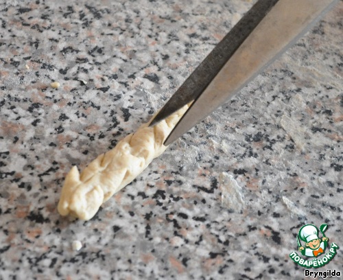Раскатывала тонкую колбаску и надсекала ножницами.