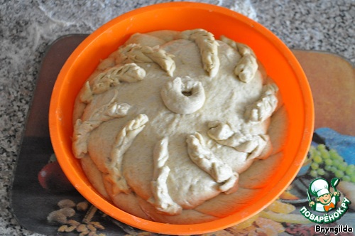 Выкладывала украшения на каравай. Смазать желтком с водой. Оставить расстояться и выпекать минут 45 в зависимости от размера вашего хлеба.