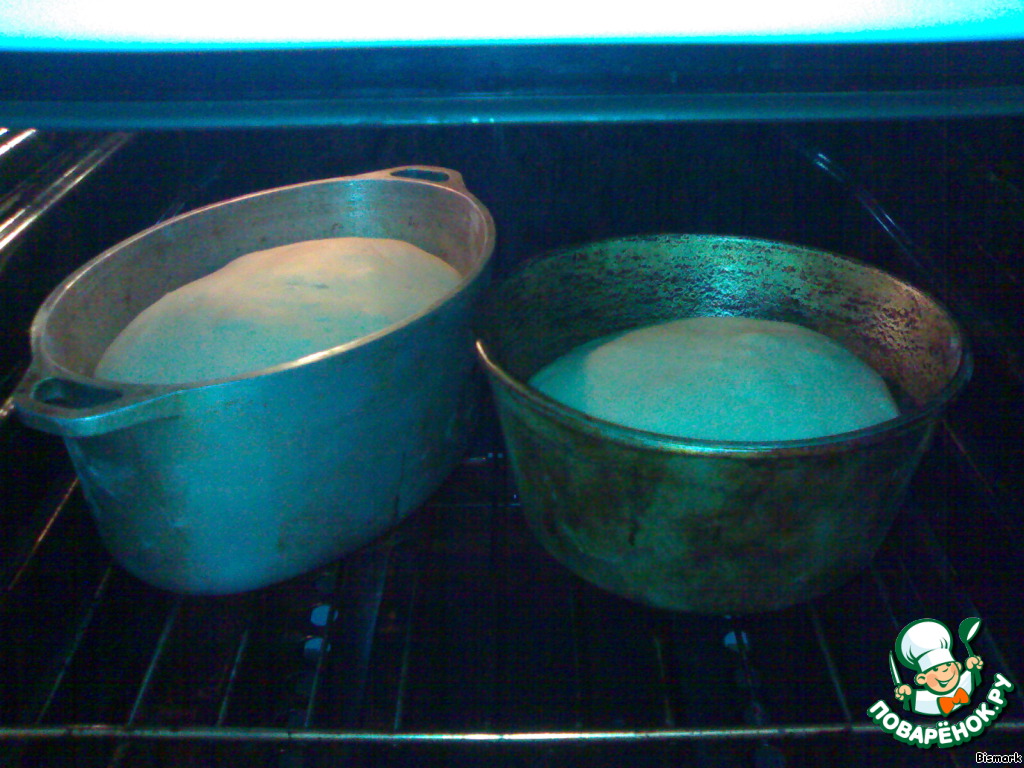 Пока чистые руки, приготовим формы для выпекания: у меня утятница и форма для круглого хлеба, доставшаяся в наследство от крёстных, работавших на хлебзаводе.))) Ставим их рядышком с кастрюлькой на стол, чтобы потом не бегать за ними, слегка смазываем, а точнее, растираем по дну, чтобы оно было слегка жирное любым жиром: маслом, магарином, подсолнечным маслом и начинаем размешивать муку в водичке.