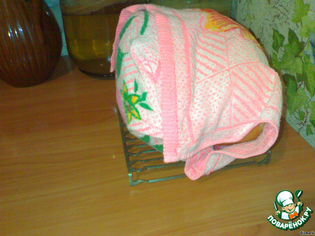 Затем, если у Вас как у меня, две буханки - укладываем их на бочок, попка к попке, а если одна, то так и иставляете на полотенце как на предыдущем фото и укутываете в полотенце.