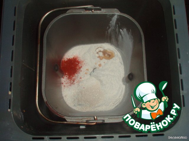 Закладываем в печку муку(просеять) , соль, сахар, масло, паприку(не обязательно). ДРОЖЖИ ПОКА НЕ КЛАСТЬ!
