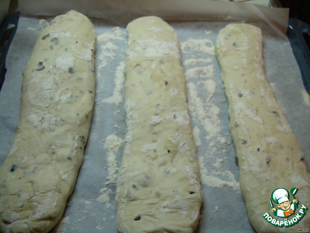 Выкладываем чиабатты на противень, хорошо подпылённый мукой, швом вниз,