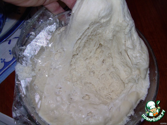 вот здесь очередная тонкость - стол мукой не подпылять и муку ни в коем случае не добавлять! Сначала тесто очень-очень липкое, но мы начинаем напитывать его воздухом, не мнём руками, как обычно, а вытягиваем и складываем.Я одной рукой придерживаю тесто, а другой растягиваю его вверх и складываю пополам, тесто прямо на глазах становится нежнее, мягче, эластичней, а наощупь оно шелковистое и упругое.