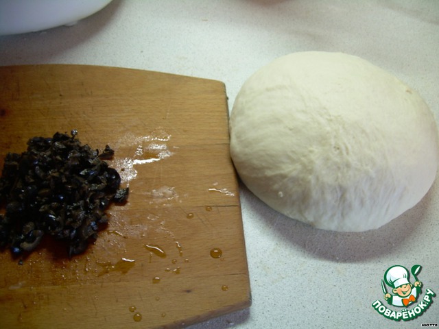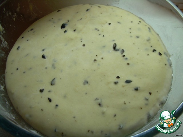 Сегодня у нас чиабатта с маслинами, поэтому в конце замеса добавляем мелко нарезанные маслины, ещё раз вымешиваем тесто, чтобы все маслины распределились равномерно,