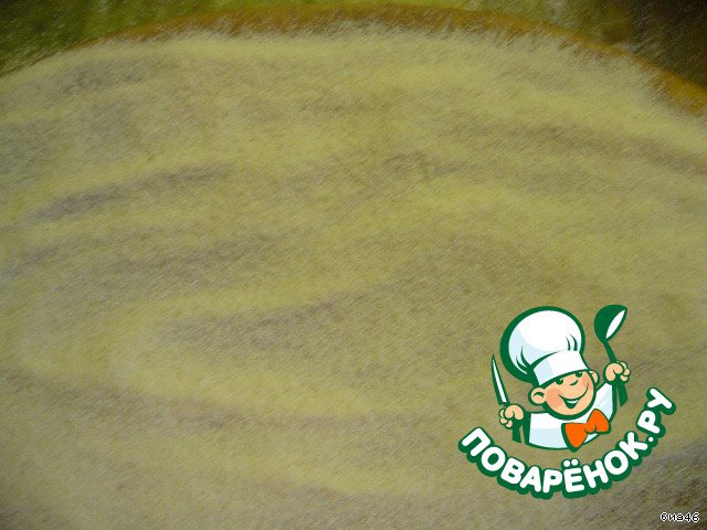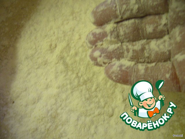 Разделочную доску не жалея присыпать манкой ( или кукурузной мукой), чтобы тесто не прилипло к доске.