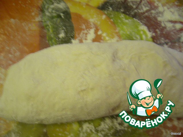 На стол присыпаем немного муки, аккуратно сначала из теста формируем шар, который руками растягиваем легонько на столе в прямоугольник.