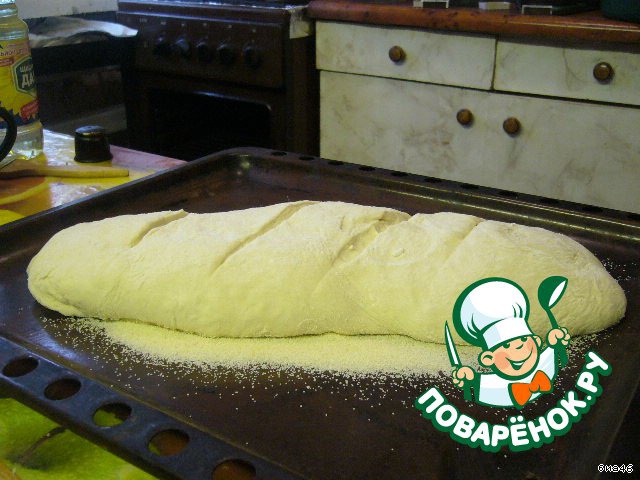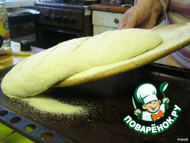 С разделочной доски багет легко по манке съехал на горячий противень (тесто снизу сразу схватится и не прилипнет к сухому противню)