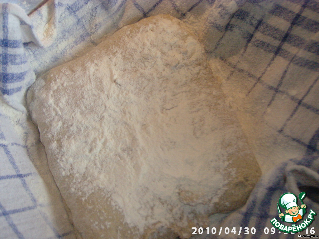 Выложить его из миски на присыпанную мукой рабочую поверхность, посыпать мукой и сложить один или два раза. Накрыть пленкой и дать отдохнуть 15 минут.