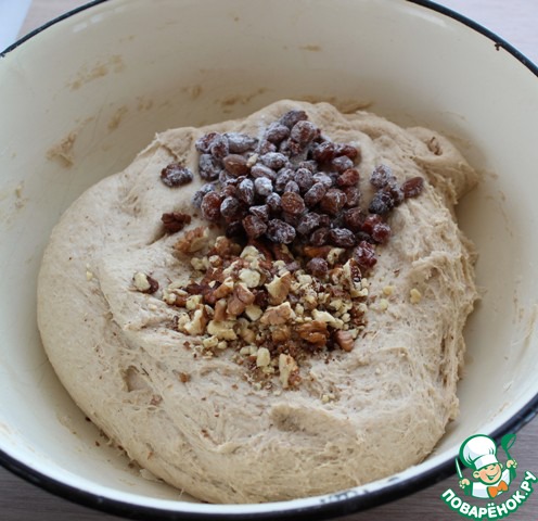 Изюм замочить в теплой воде на 5-10 мин. Обсушить и обвалять в муке, так он равномерно распределится в тесте. Орехи порубить не слишком мелко. Добавить изюм и орехи в тесто, перемешать,