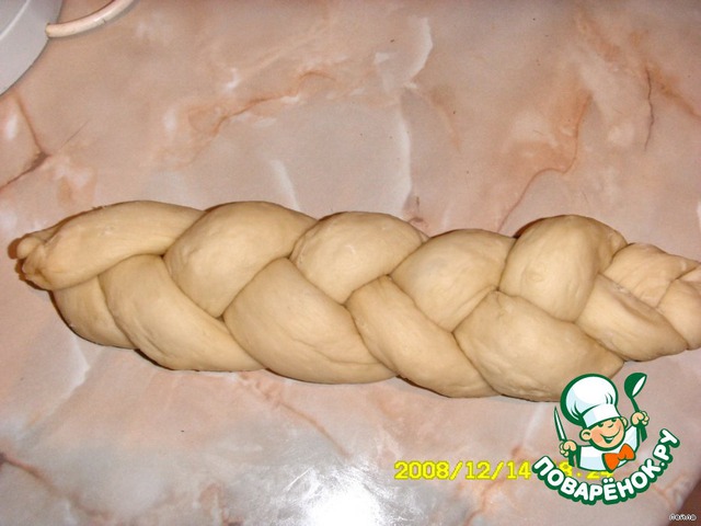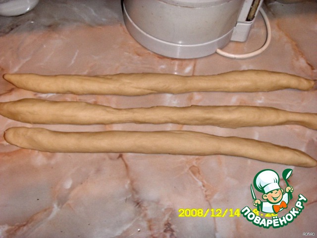 Тесто осадить и разделить на 3 части.Из каждой сформировать одинаковой длины колбаски