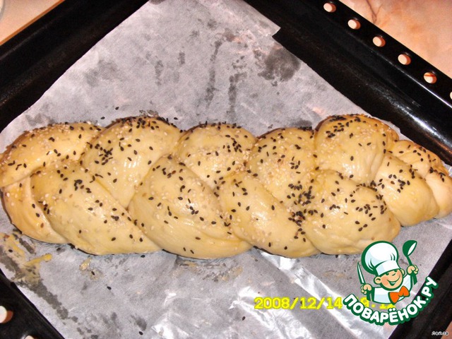Выложить косу на противень выстеленный пергаментной бумагой или на силиконовый коврик. Прикрыть пленкой и оставить на расстойку, на 20-30 минут, коса должна снова увеличиться в объеме. Смазать верх косы взболтанным желтком и посыпать маком или кунжутом.