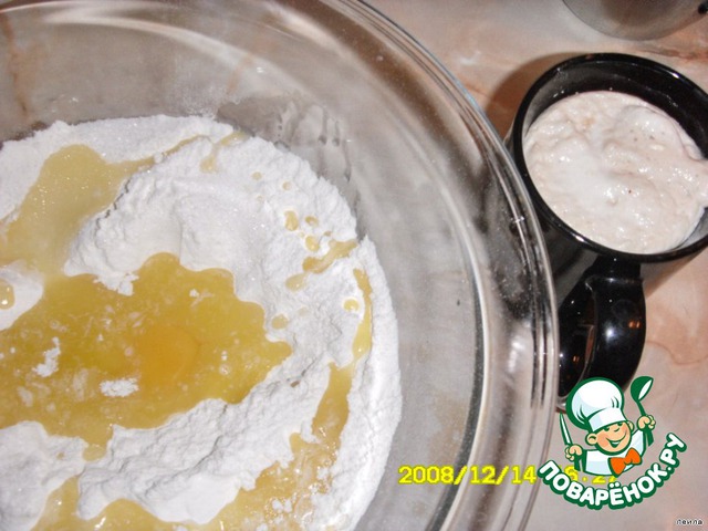 В миску всыпать муку, сделать в ней углубление и влить в него подросшие дрожжи, яйцо взбитое с остатком сахара, растопленное, теплое масло, воду и тщательно замесить мягкое тесто. Месить до тех пор, пока в тесте не появятся пузырьки воздуха.
