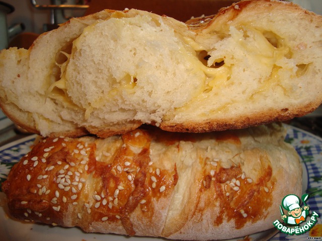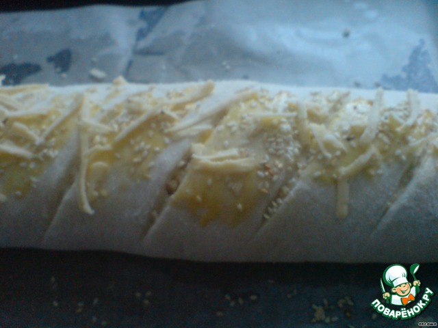 Придаем рулету форму батона, делаем неглубокие надрезы на поверхности, посыпаем сыром и кунжутом. Можно, предварительно, смазать батон яйцом.